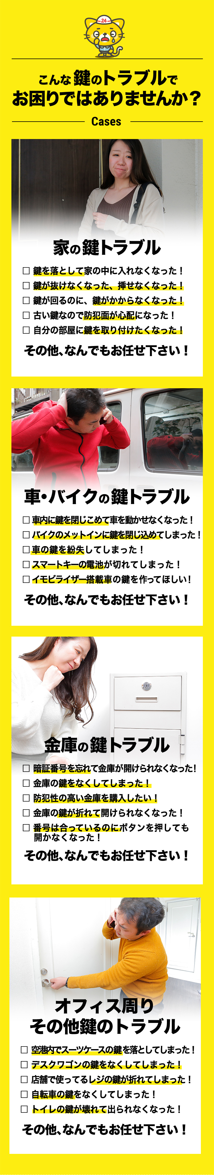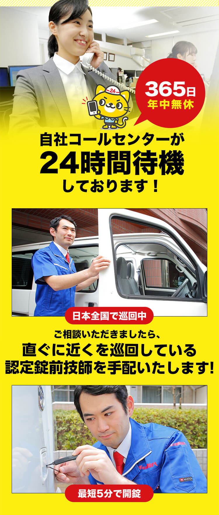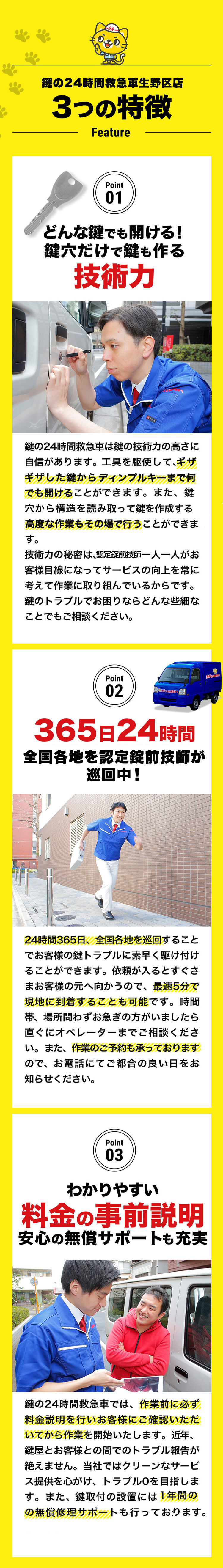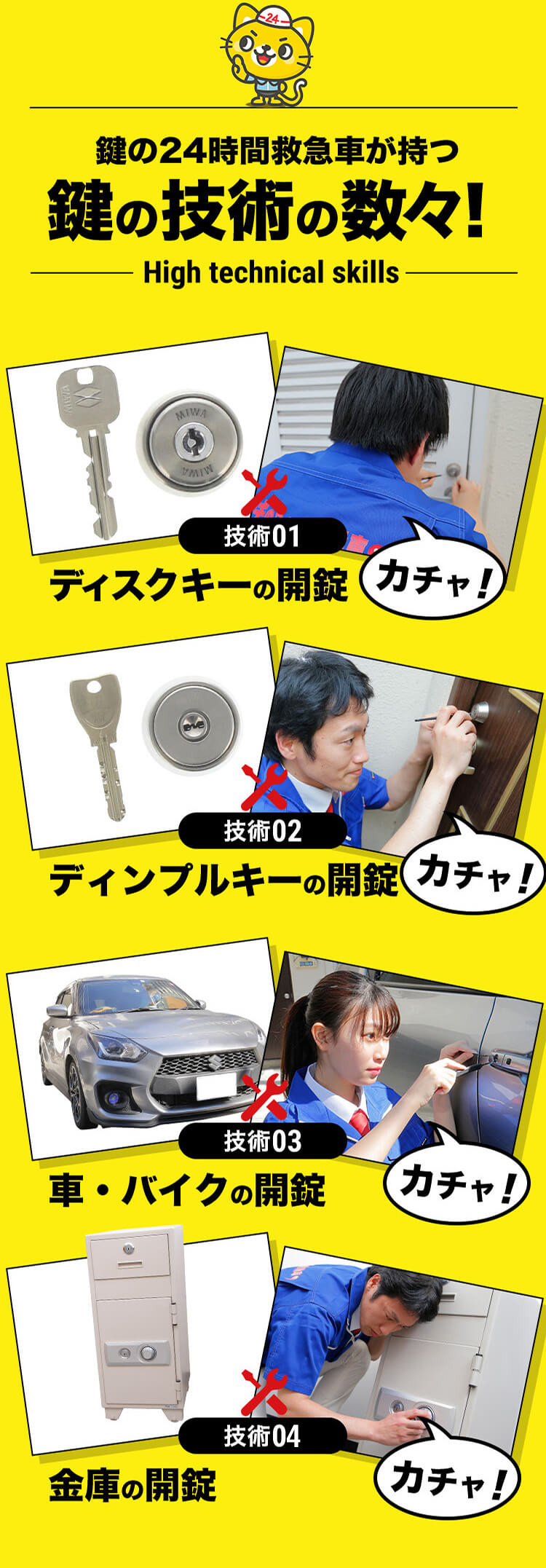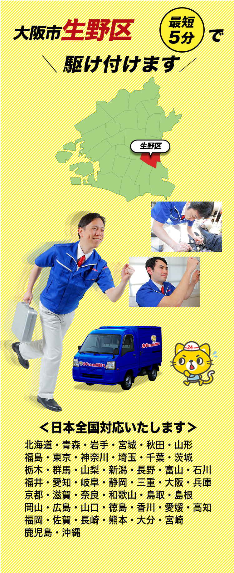 生野区の「カギの出張24時間」は、生野区全域で鍵のトラブルに迅速に対応します。清潔な服装で訪問し、作業前のわかりやすい説明と納得価格でサービスを提供。お客様の安心と信頼を獲得しています。